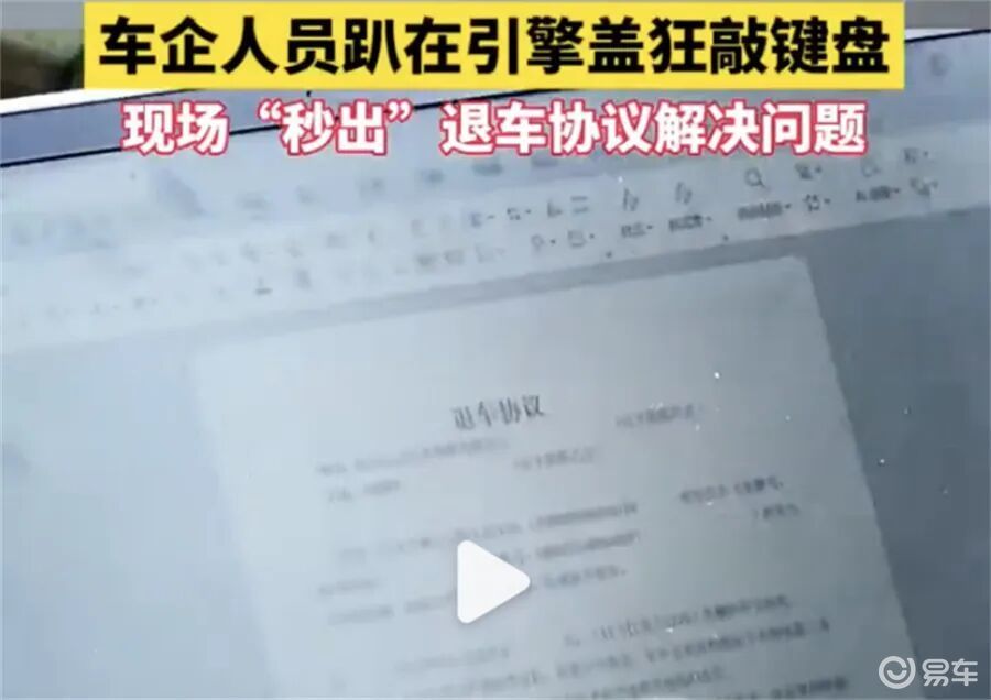 这个是今年最有画面感的一幕。车主死活不满意,谈不拢,围观群众越来越多,眼看车就要开进展区了。厂家工作人员急了——直接把笔记本电脑往车的引擎盖上一架,当场给车主拟退车协议。